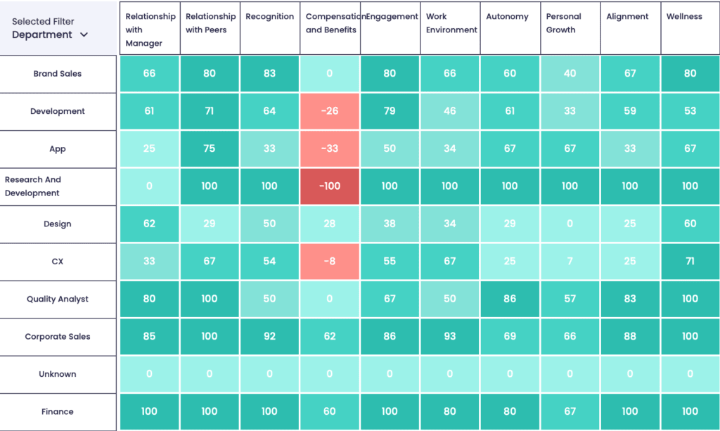 4. Segments– Under this section, the HR Admin can view the category-wise engagement score via the department, the cities, and the genders that participated in the survey.