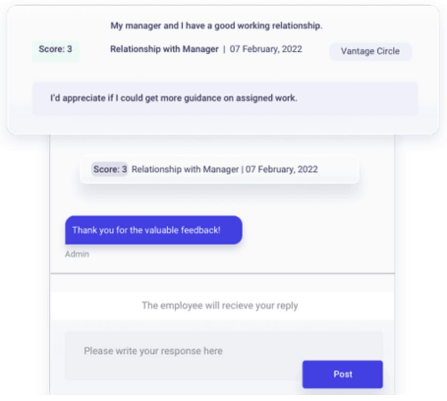 Anonymous Feedback–– The Admin can reach out to employees to follow up on the feedback they have provided on the survey questions. They will receive a mail with their response, to which they can reply and have an anonymous conversation.