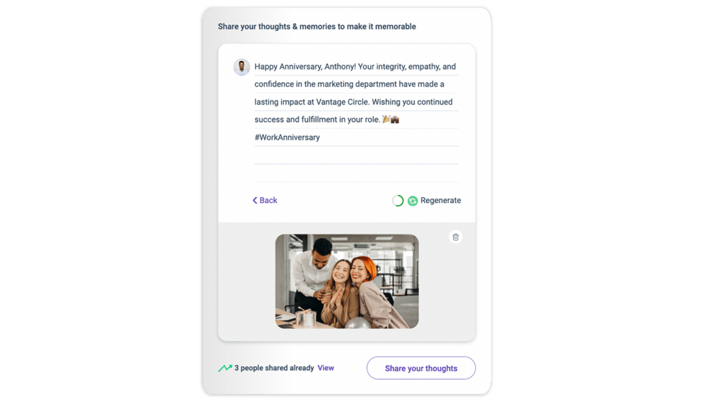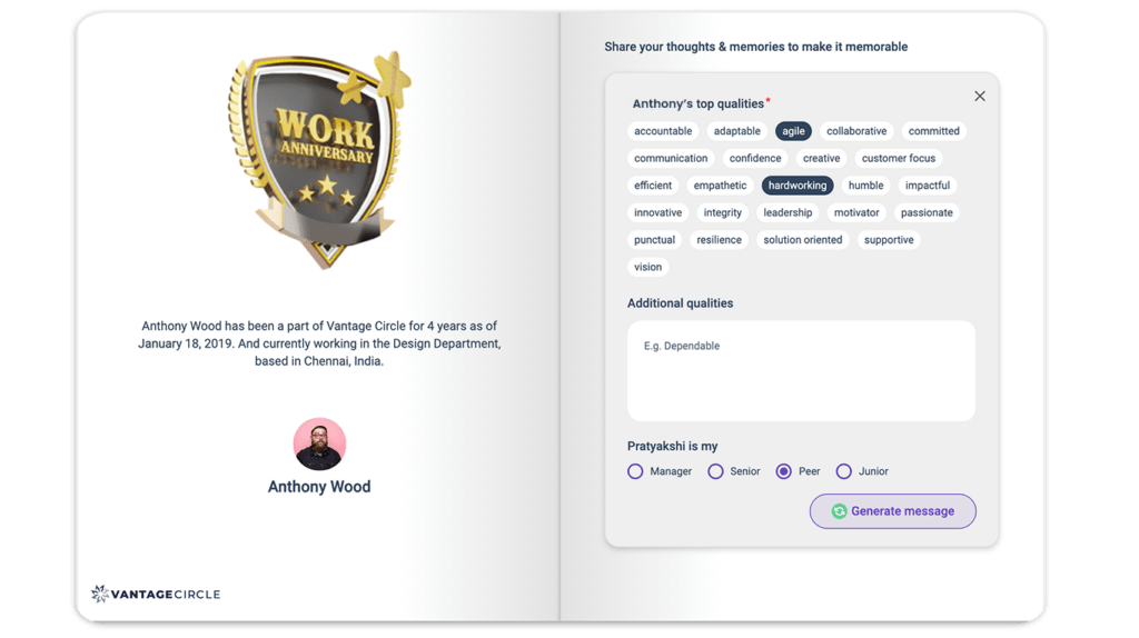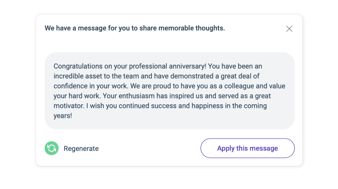 Last but not least, we've introduced an AI-powered message generator tool to help you create personalized messages for your colleagues. This tool uses the values you enter for your colleagues as inputs and generates custom messages tailored to their individual profiles. This feature saves you time and effort in crafting the perfect message while still maintaining a personal touch.