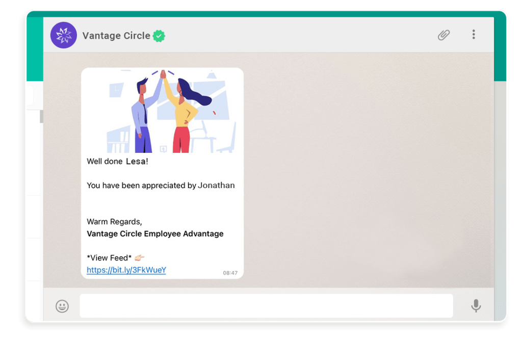Notifications for Vantage Rewards lets you celebrate workplace achievements by getting notified in WhatsApp anytime, anywhere.